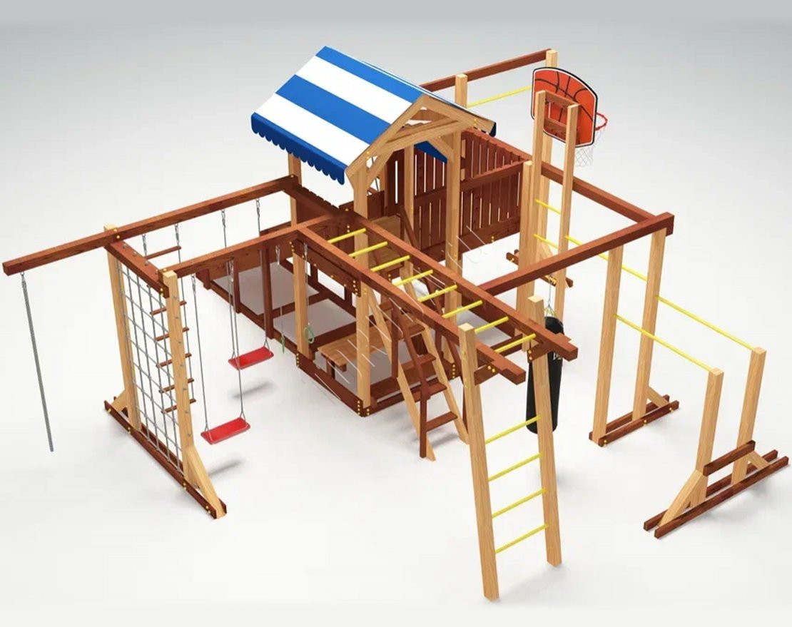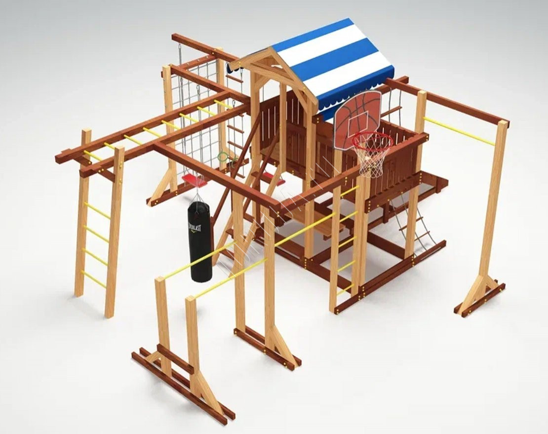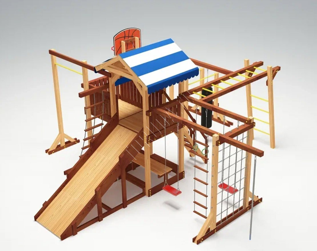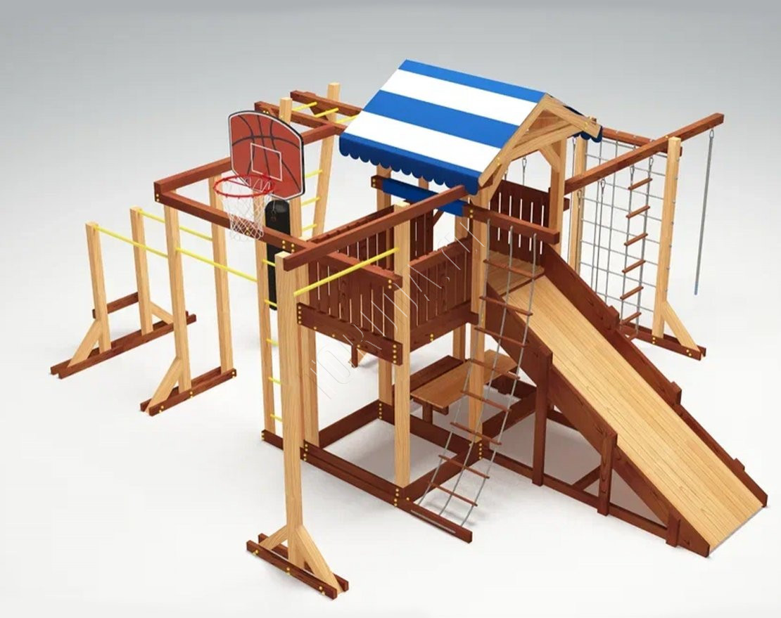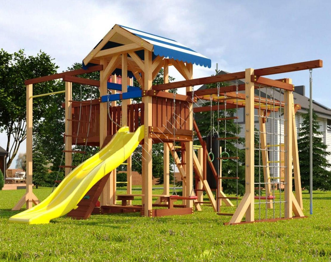 - В центре комплекса - игровая башня с яркой двухцветной крышей из материала “Оксфорд”. Чтобы подняться в неё, нужно преодолеть сетку-лазалку, скалодром или лестницу-трап с узкими ступенями. Спуститься вниз можно теми же путями, а также самым интересным и весёлым - съехать по трёхметровой горке. В зимний период горка может быть заменена на деревянный скат (поставляется в комплекте). Ширина ската 93 см позволяет кататься с него на ледянках и тюбингах.