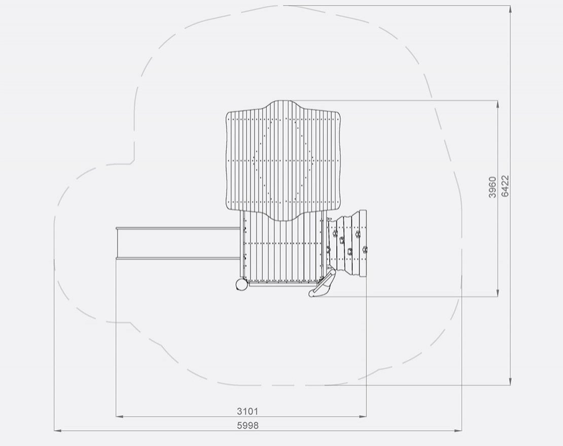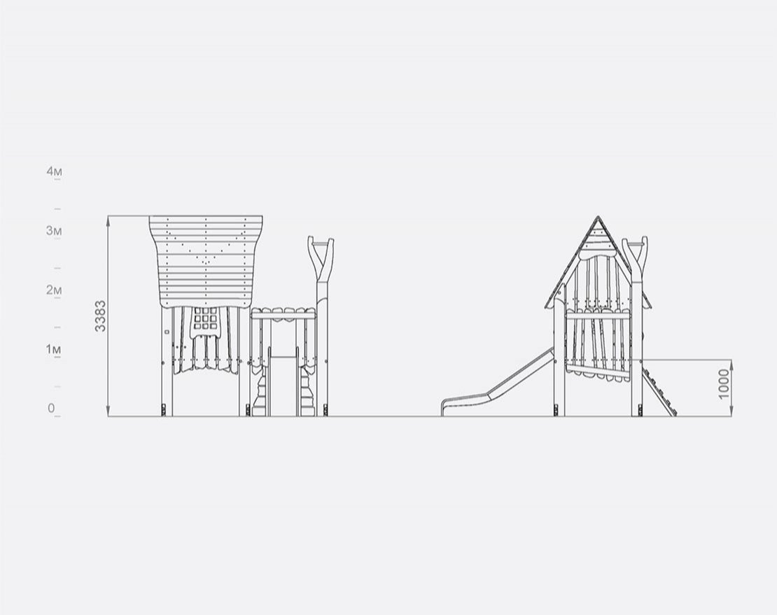 Представляет собой закрытый домик с крышей, стенами, окнами, небольшой металлической горкой с защитными бортиками и пандусом со скалодромными зацепами. Внутри домика установлена небольшая скамейка и подоконник. Для большего комфорта, конструкция оснащена ручками-стропами.
