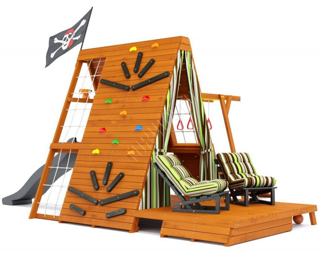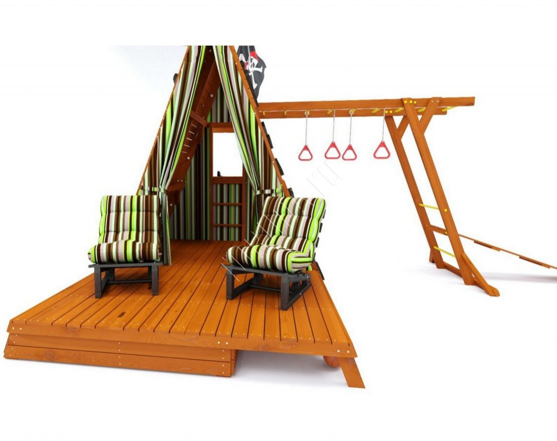 - Одной из особенностей домика являются удобные кресла для отдыха, которые позволят и вам, и вашим детям отдохнуть после игры или занятий спортом. Кресло имеет несколько положений спинки, что позволяет подобрать комфортное положение как для взрослых, так и для детей. В комплекте с площадкой идет 2 кресла.