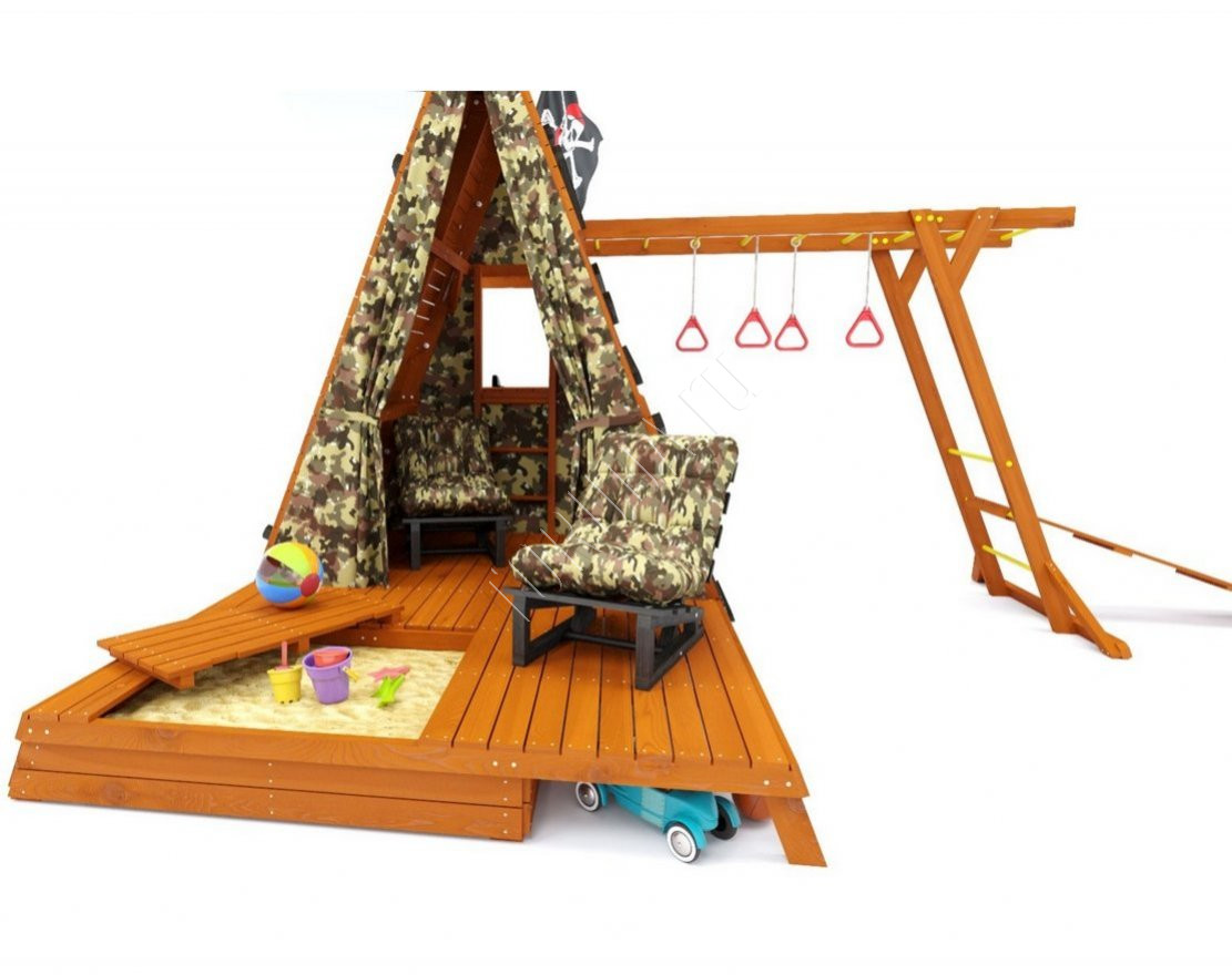 - На игровой площадке можно найти много интересных развлечений: встроенная в подиум-сцену песочница с двумя снимающимися створками, зона хранения игрушек и ящиков с игрушками под подиумом-сценой, качельный блок с качелями в виде лодочки и боксерскую грушу. Внутренний деревянный пол площадью большого домика также является отличным местом для занятий спортом и игр.