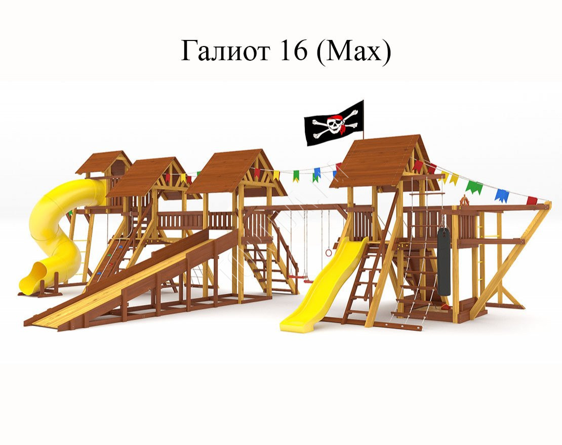 Площадка Галиот 16 обладает довольно широким функционалом (который по желанию можно легко расширить). А на качелях могут кататься даже родители! Детская площадка предназначена для дачи, коттеджа.