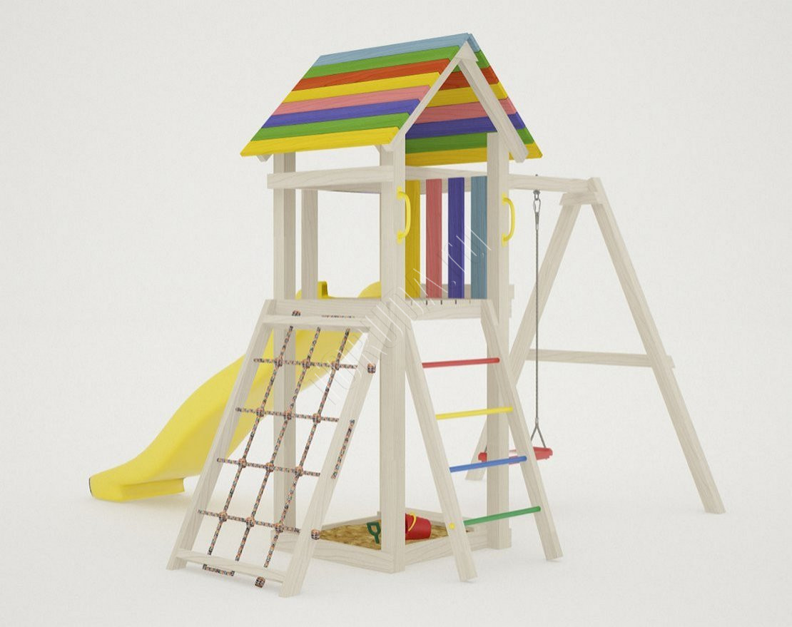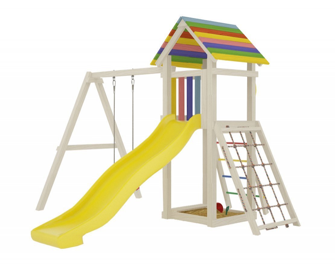- Домик закрыт сверху деревянным перекрытием – оно скрывает от прямых солнечных лучей и позволяет передохнуть на свежем воздухе. Комплекс универсален, поскольку включает в себя столь любимые детьми горку и качели.