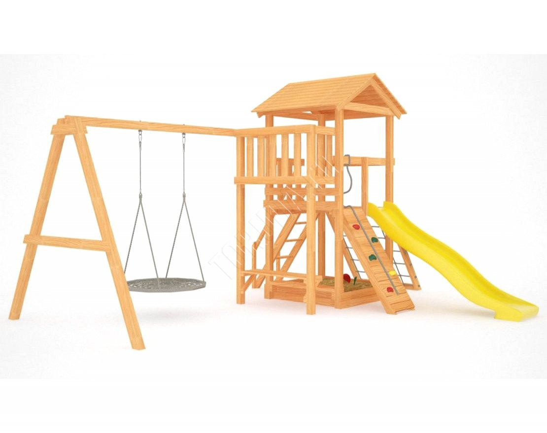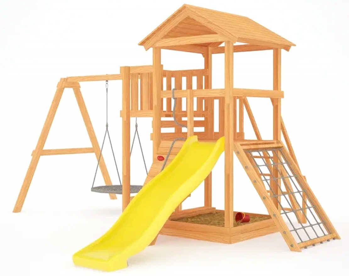 Он безопасен даже для малышей – все крепежи скрыты под заглушками, металлические детали покрыты порошковой краской, а навесное оборудование произведено специально для детей в Бельгии. Основной материал натуральный, балки клееного бруса не выкрашены, края скруглены. Конструкция, качество дерева и подвесные атрибуты соответствуют ГОСТ. Светлая, современная и универсальная площадка удачно расположится в коттеджном посёлке, на территории частного дома или дачного участка.