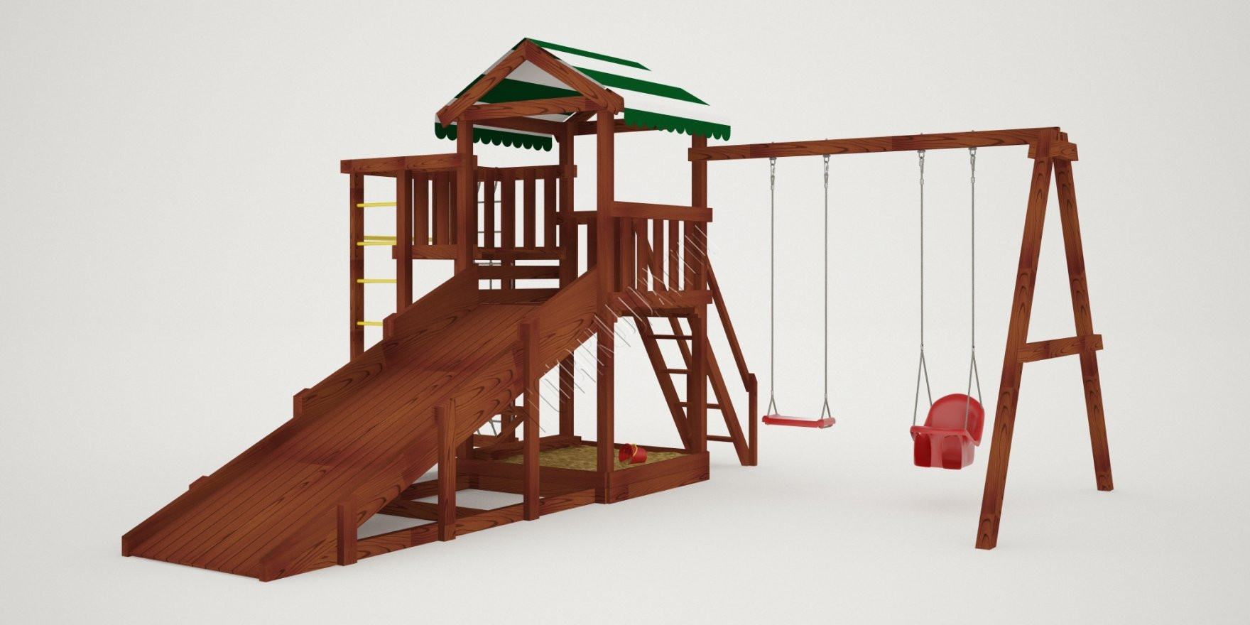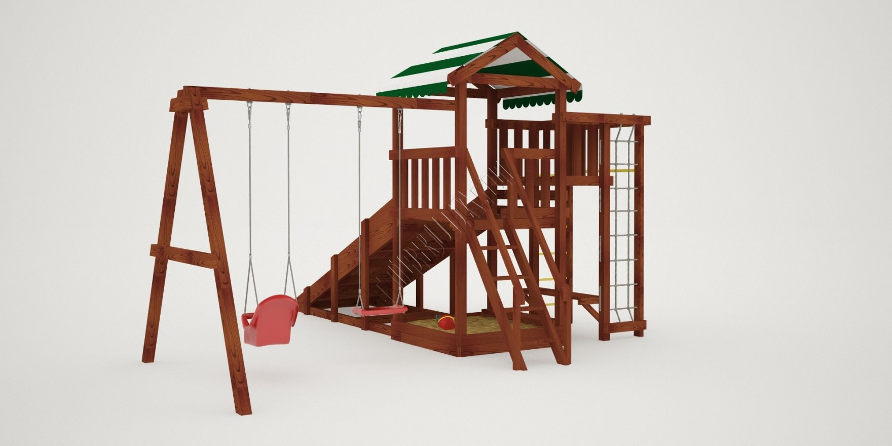 Конструкция сертифицирована и безопасна. Крепежи скрыты под хорошо закрепленными заглушками – поэтому даже малыши не поранятся. Каркас состоит из натуральных деталей – клееного бруса квадратного сечения со стороной 75 мм. Во избежание получения заноз и ссадин дерево отшлифовано, а края скруглены.