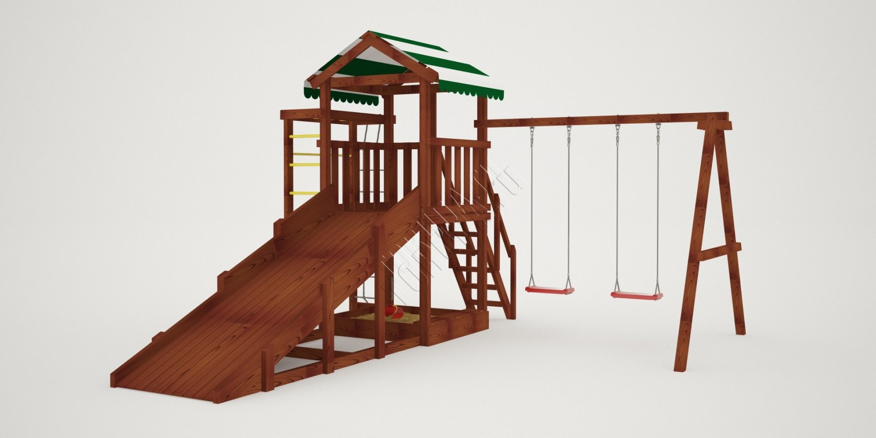Конструкция, качество дерева и качельные подвесы соответствуют ГОСТ. Основной материал натуральный – это экологичный клееный брус, он гладкий на ощупь, его углы скруглены во избежание получения ссадин. Площадка полностью безопасна: все крепежи и болты плотно закрыты заглушками, а спортивное оборудование используется от проверенного сертифицированного бельгийского производителя.