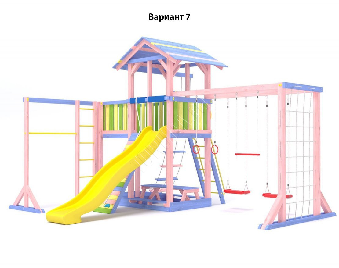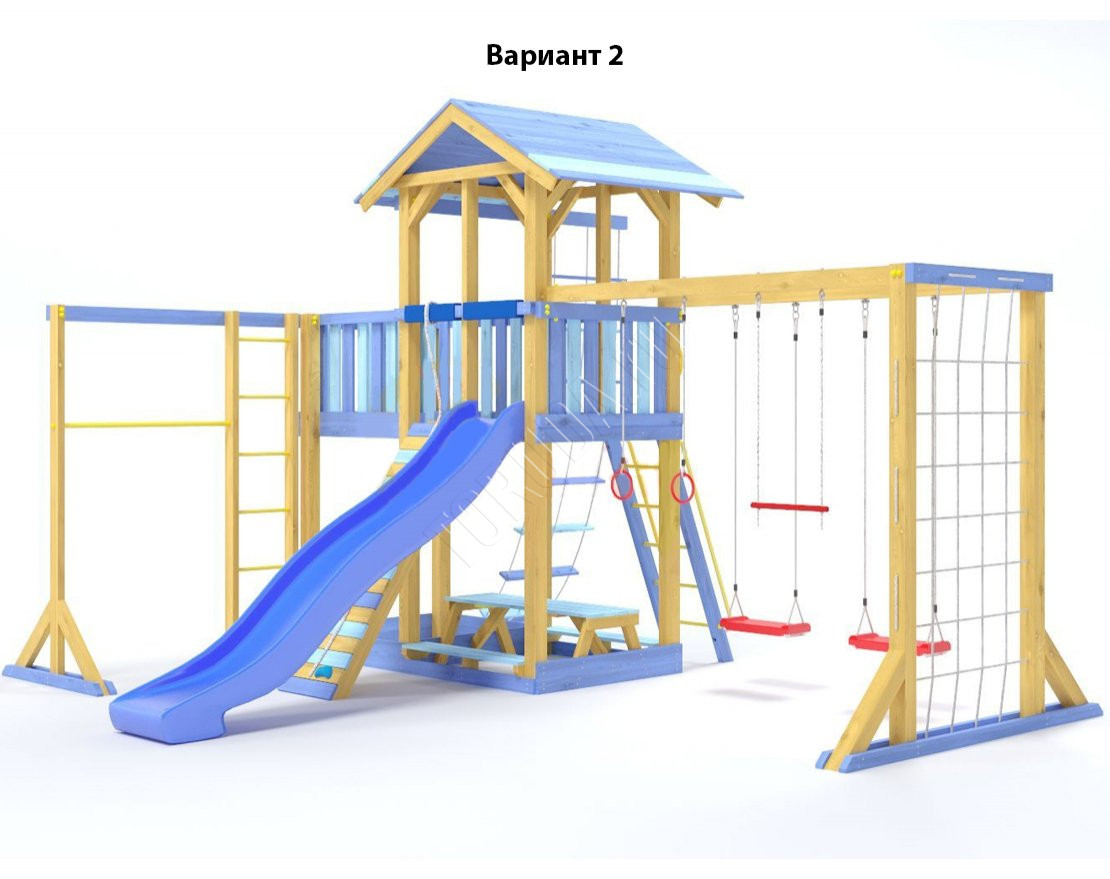- Комплектующие игровой площадки изготовлены из всесезонного пластика и клееного бруса повышенной прочности, что обеспечивает полную безопасность и вместе с тем прочность и долговечность конструкции.