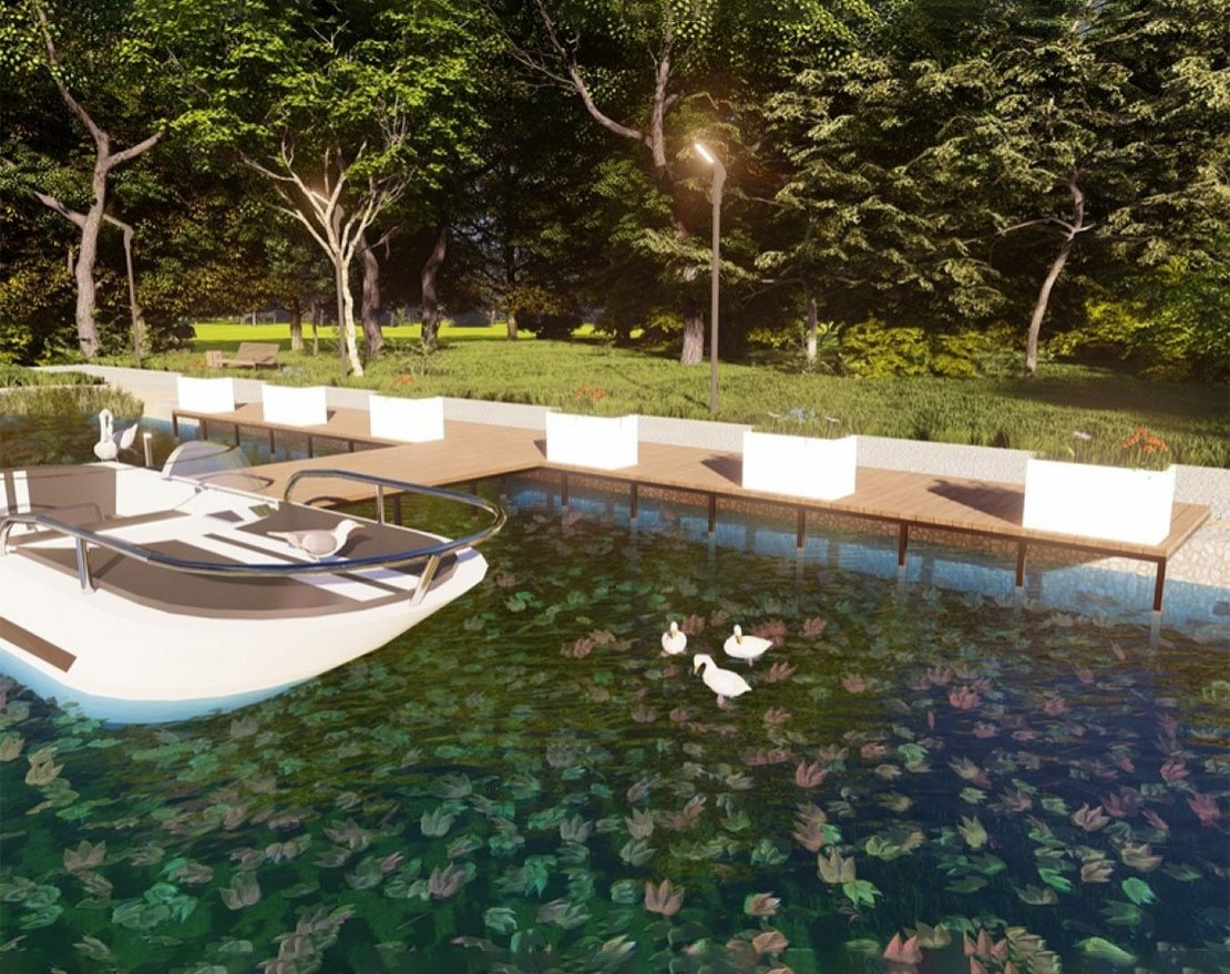 Пирс будет укреплен сваями, что обеспечит его стабильность и прочность.